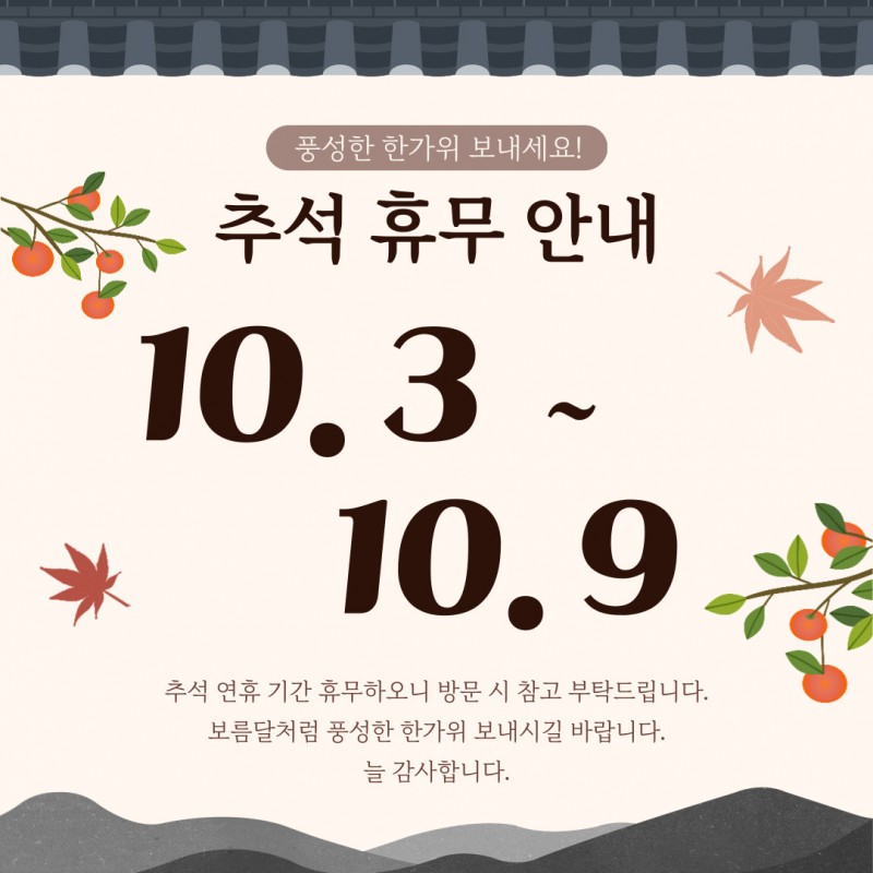 센터 추석명절휴관 안내 페이지 정보 작성자 최고관리자 작성일25-10-01 09:34 조회264회 관련링크 다음글 프린트 목록 본문 ※ 센터 추석명절휴관 안내 ※ 명절기간 동안 본 센터는 휴관입니다!휴관 일정 : 2025. 10. 03.(금) ~ 10. 09.(목) 즐거운 명절되세요~^^ - 부산사하두송지역자활센터 임직원 일동 - 다음글 프린트 목록