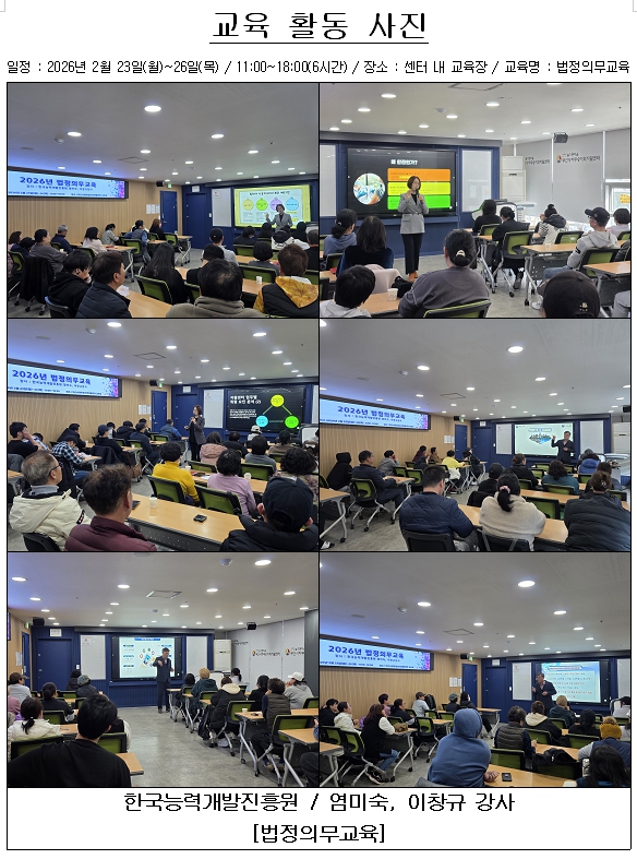 2026년 정부에서 주관하는 근로자 법정의무교육(5인 이상 사업장)을 실시하여 자활사업 참여 근로자들의 안정적인 근무 여건을 조성하는 계기를 마련하였습니다.